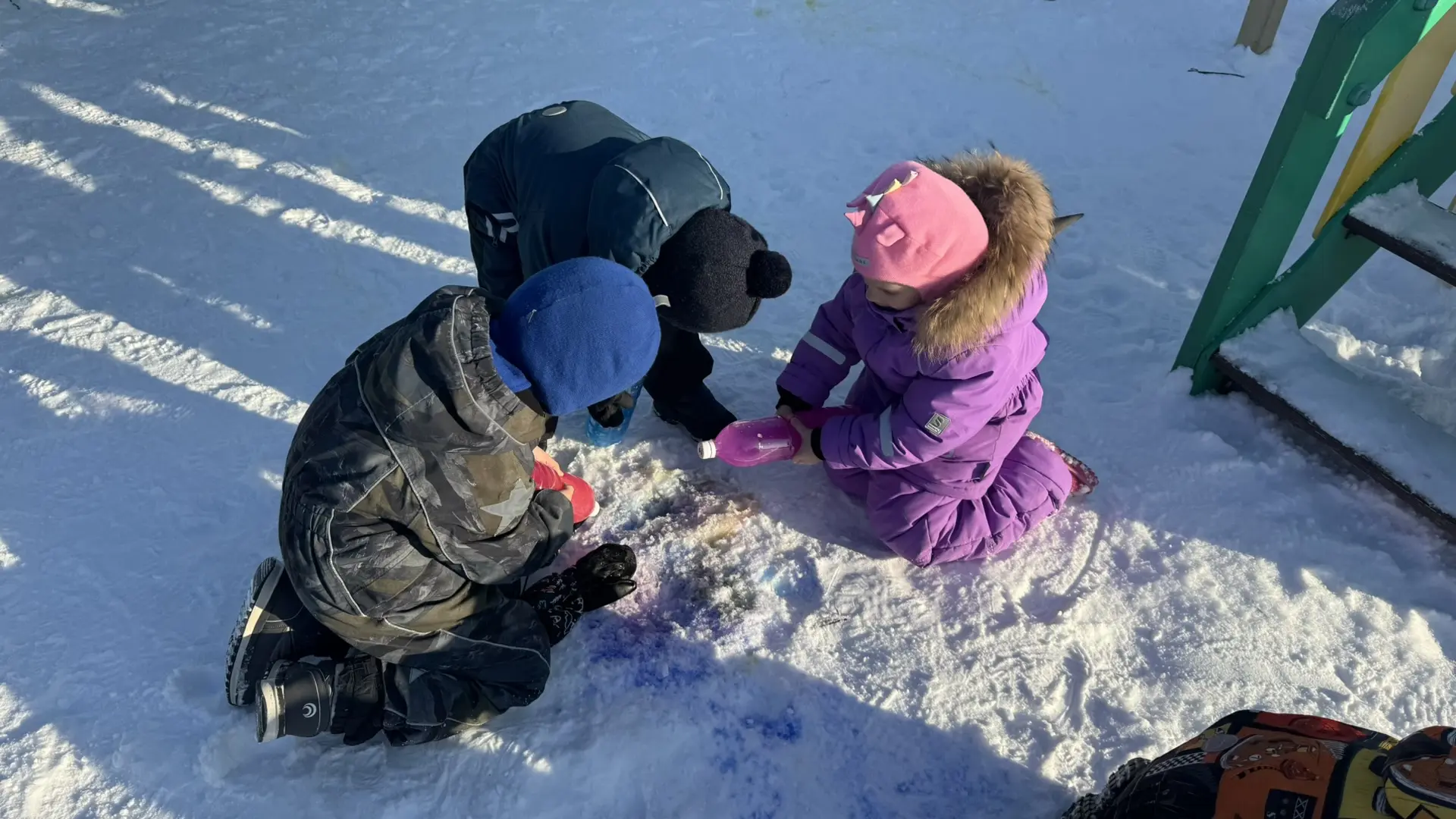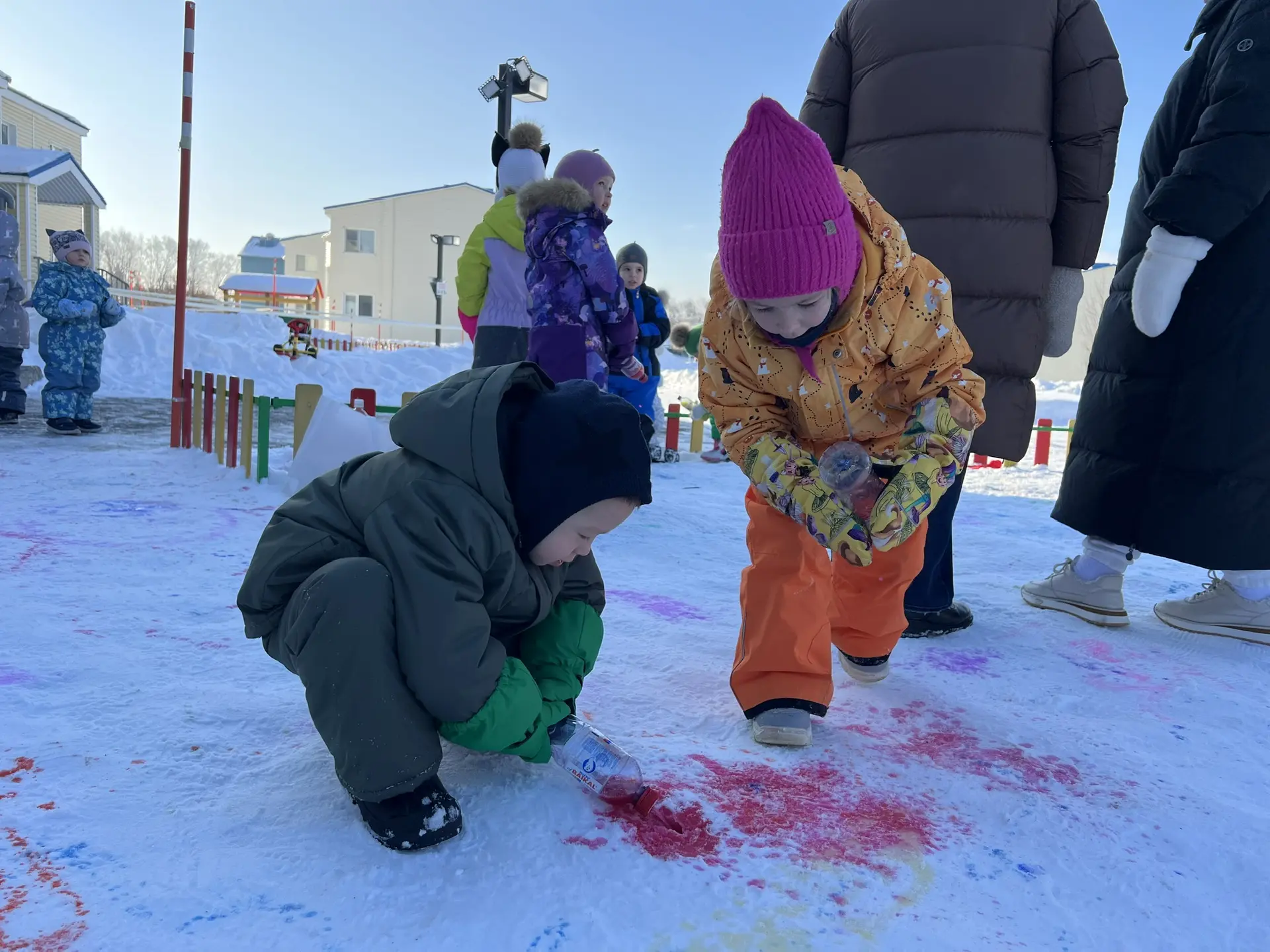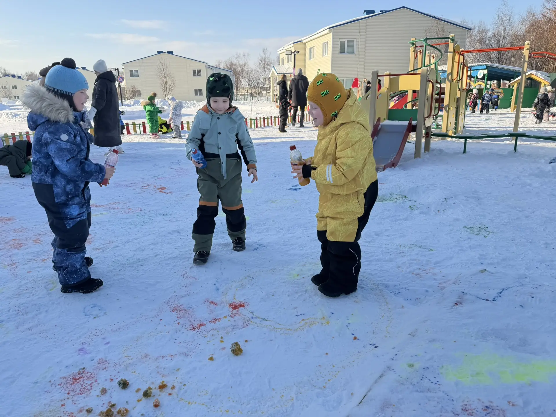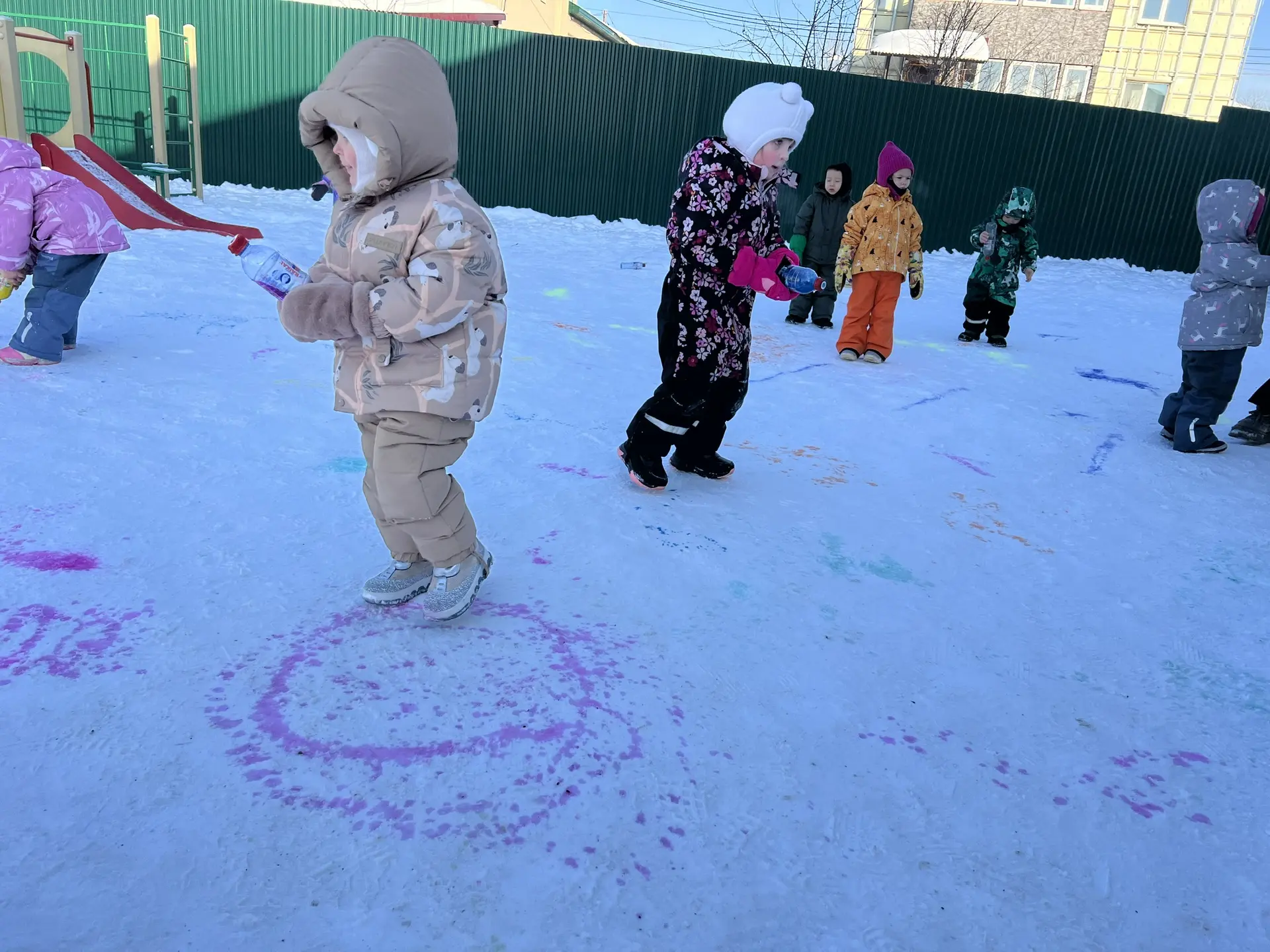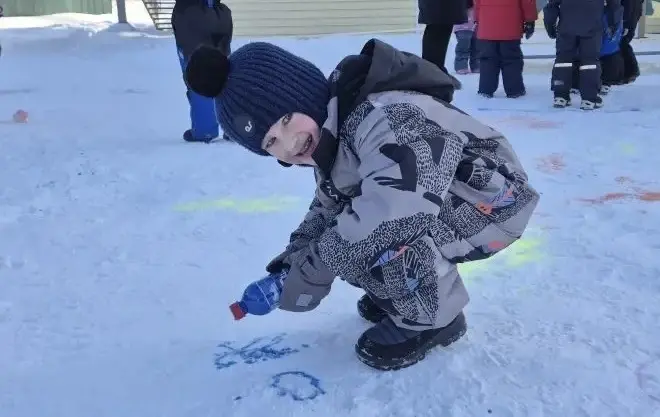 Для творческих порывов участников прогулки был выделен огромный белый холст. Вооруженные яркими красками в бутылках, юные художники принялись оживлять белоснежное покрывало смелыми мазками цвета. Фантазия бушевала неудержимо, превращая зимний пейзаж в яркое полотно, испещренное всеми цветами радуги.