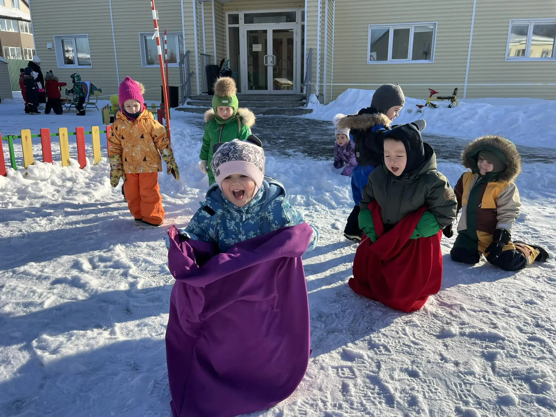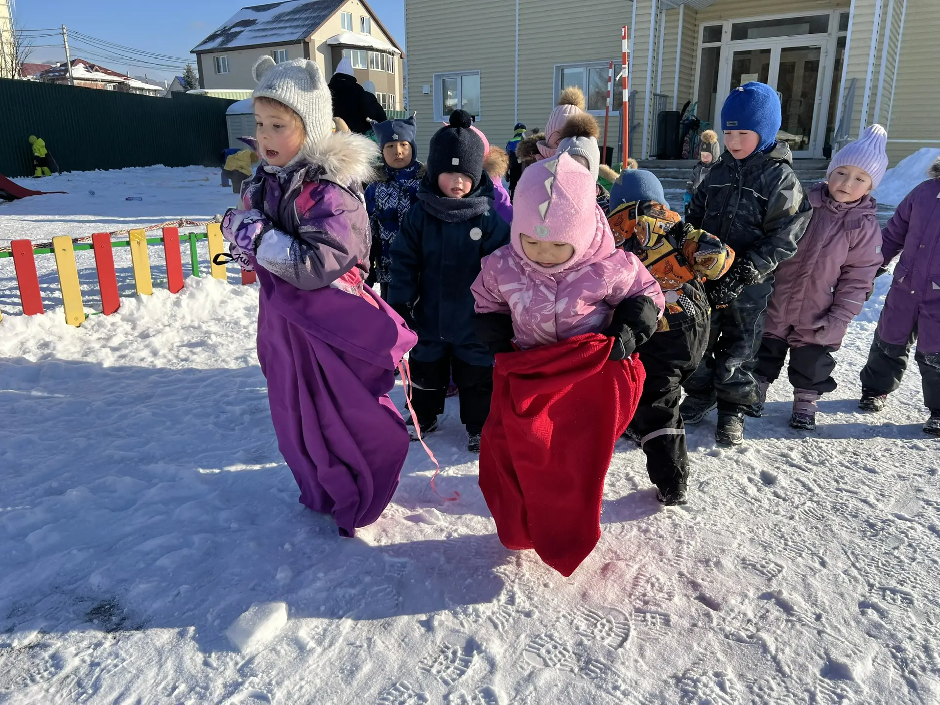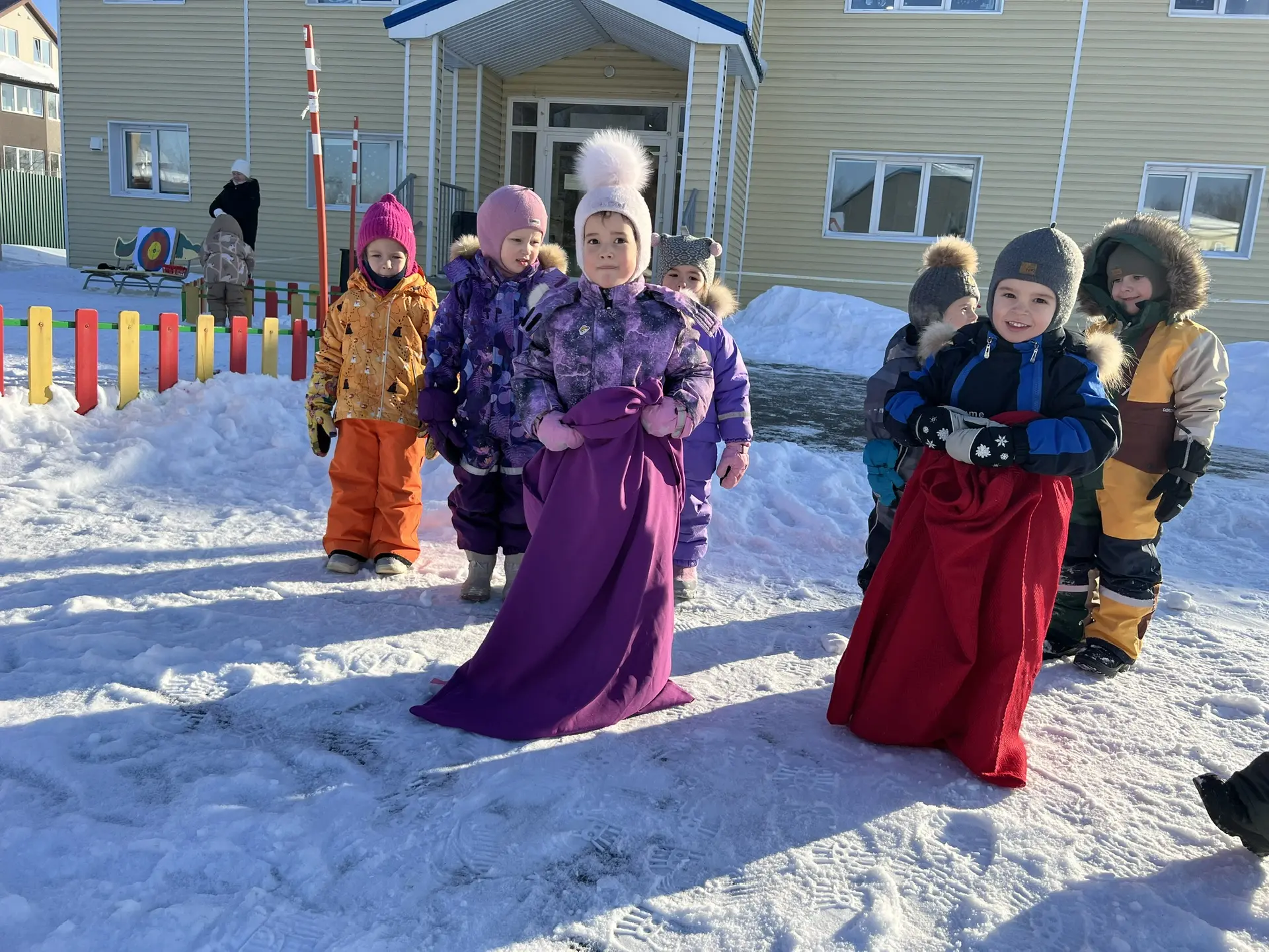 Пока кто-то участвовал в напряженном поединке, другие выбрали развлечение полегче – веселые прыжки в мешках. Забавно прыгая, смешно падая и поднимаясь вновь, дети вовсю демонстрировали чувство юмора и невероятную находчивость. Гулкий смех звучал повсюду, согревая сердца и души участников.