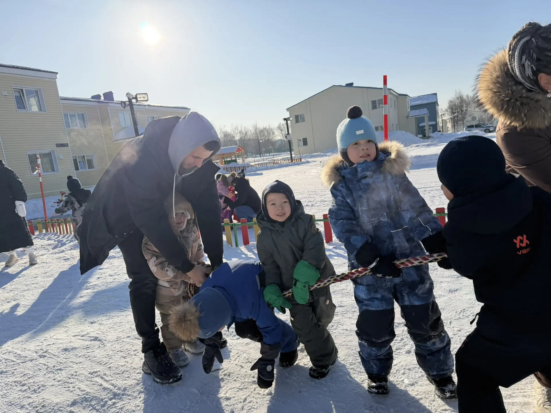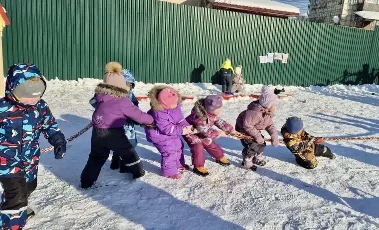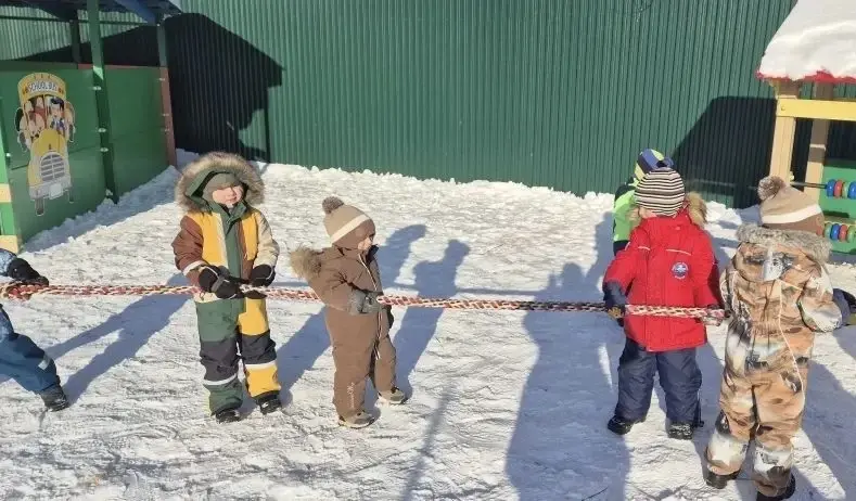 Традиционный турнир – перетягивание каната, сразу привлек внимание мальчишек и девчонок. Дети поделились на два воинственных лагеря и вступили в схватку, наполненную азартом и дружеским соперничеством. Дух единства царил над полем битвы, несмотря на напряжение и жаркую борьбу, ведь здесь каждый участник понимал: победа – дело общее!